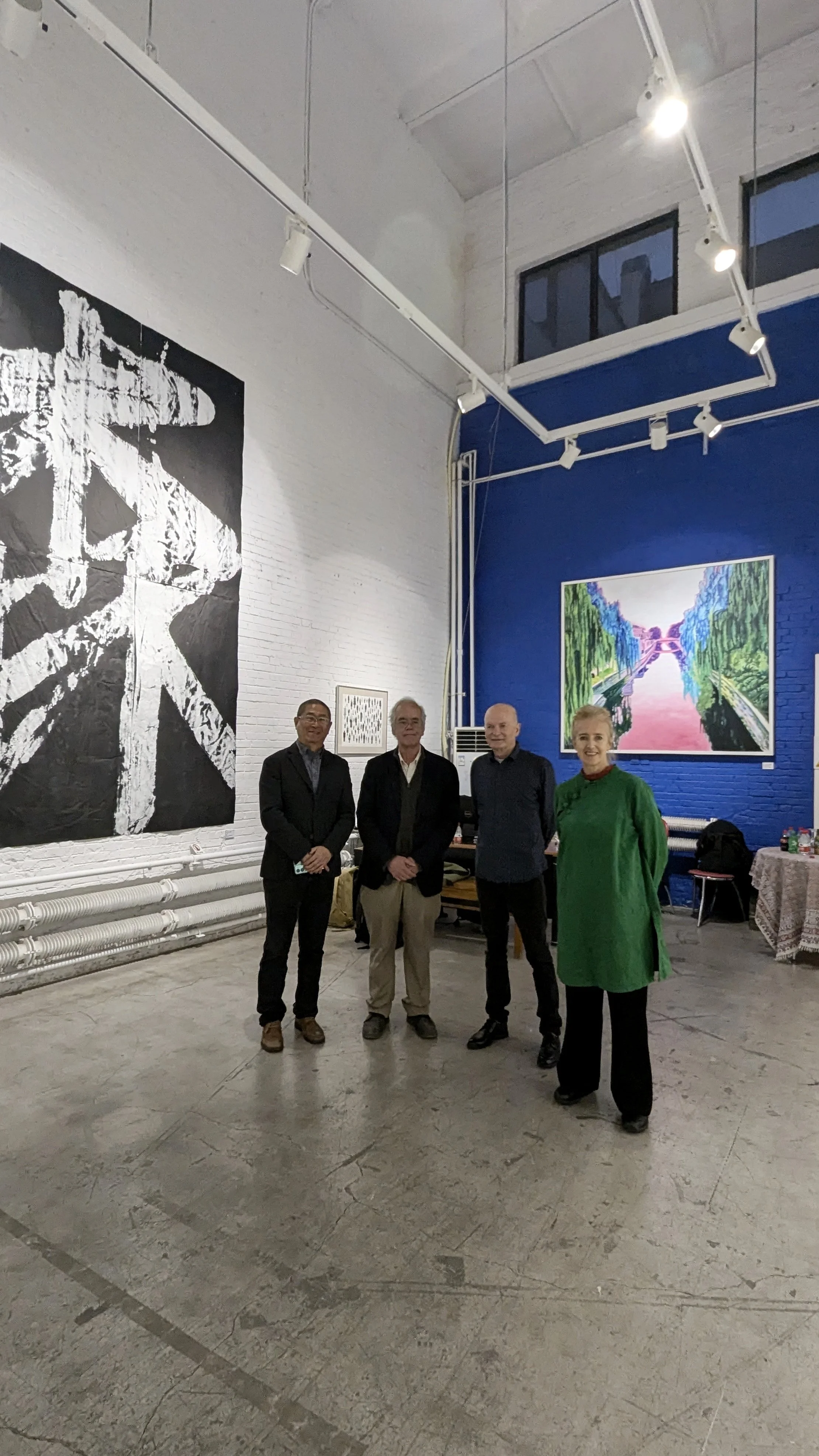 Zhang Zhaohui, David A. Brubaker, Brian Wallace, and Niamh Cunningham (left to right) standing to the right of Zhang’s multi-paneled ink painting Tree (2024).